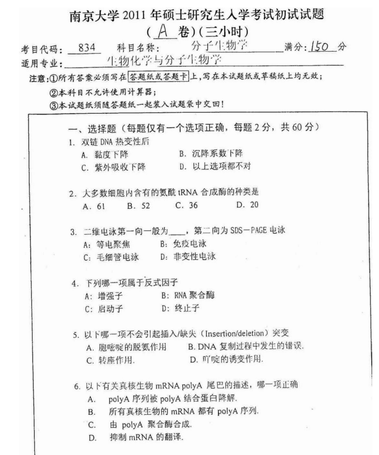 1996-2012、2013年南京大学834分子生物学A真题试卷(生科院)