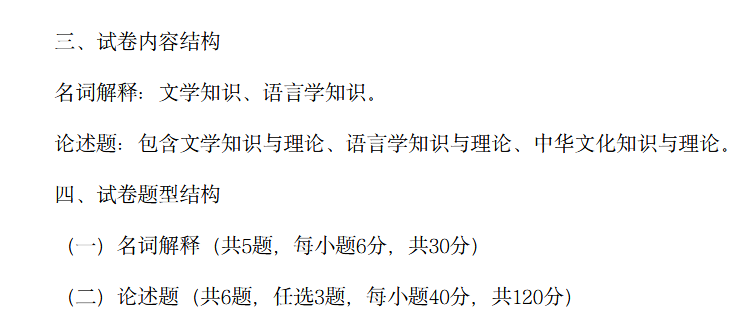 本课程主要考查本科阶段所学的《文学概论》、《古代文学》、《现当代文学》、《外国文学》、《现代汉语》、《古代汉语》、《语言学概论》共七门课程的基本内容。《文学概论》要求学生掌握本课程的相关概念、知识、原理;《古代文学》、《现当代文学》、《外国文学》、要求学生掌握及知晓相关重要作品、人物、流派及文学现象,具备阅读和分析古今中外文学作品的基本能力;《语言学概论》、《现代汉语》和《古代汉语》要求学生了解语言学研究的对象、目的及现代汉语和古代汉语的功能和特点,能运用所学的汉语知识,对一些汉语现象进行基本的理论分析。