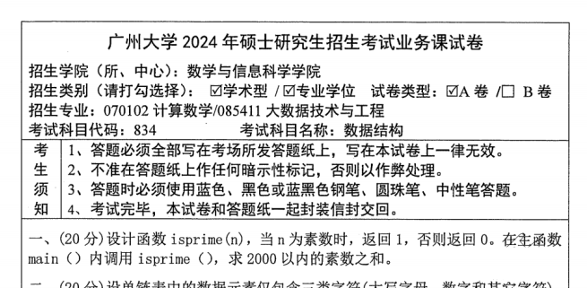 2026广州大学834数据结构考研全套资料【真题无答案+笔记题库】