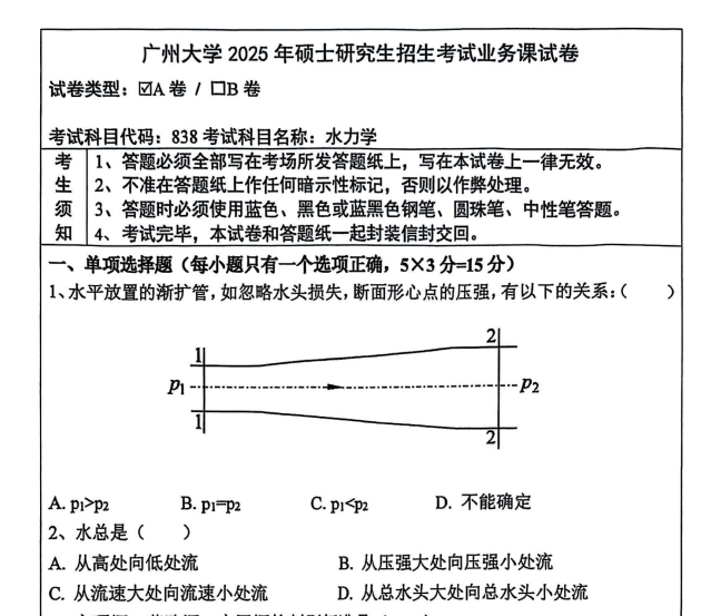 2027广州大学土木工程学院838水力学考研全套资料【真题+课后答案】