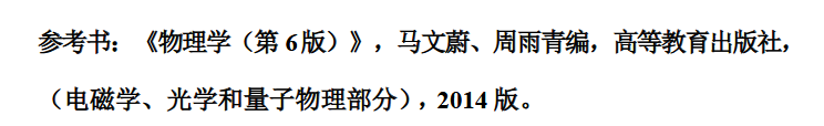 《物理学 (第 6 版)》,马文蔚、周雨青编,高等教育出版社, (电磁学、光学和量子物理部分),2014 版。