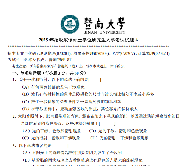 2011-2014,2016-2025年暨大811普通物理考研真题试卷